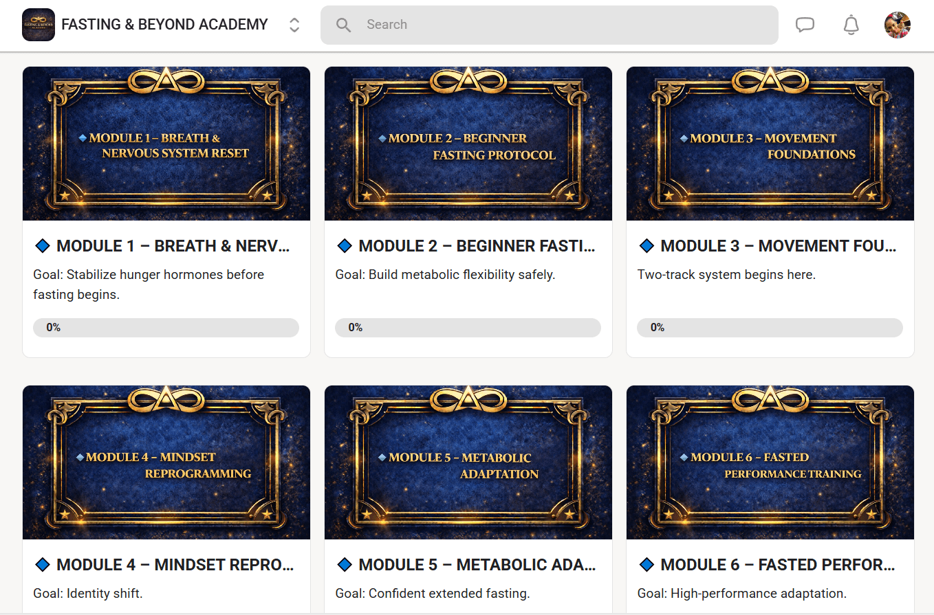 FASTING & BEYOND ACADEMY is a structured system that helps you build stable energy, metabolic flexibility, strength, and long-term vitality — without extremes.